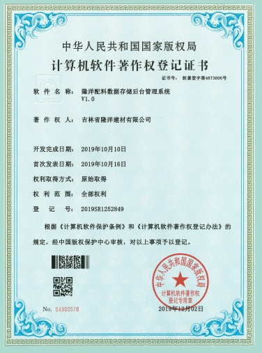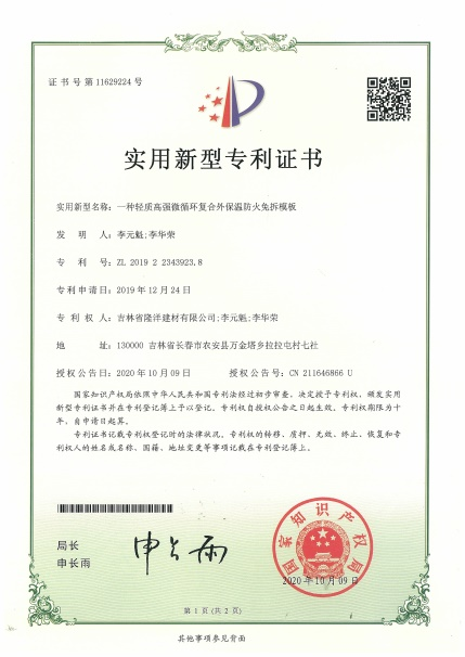 是吉林省隆洋建材有限公司生態(tài)安全與科技創(chuàng)新 “發(fā)明專利”;發(fā)明專利號(hào):ZL 2019 2 2342013.8。