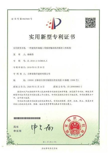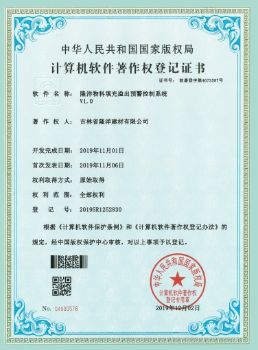 是吉林省隆洋建材有限公司生態(tài)安全與科技創(chuàng)新 “發(fā)明專利”;發(fā)明專利號(hào):ZL 2019 2 0158616.X。