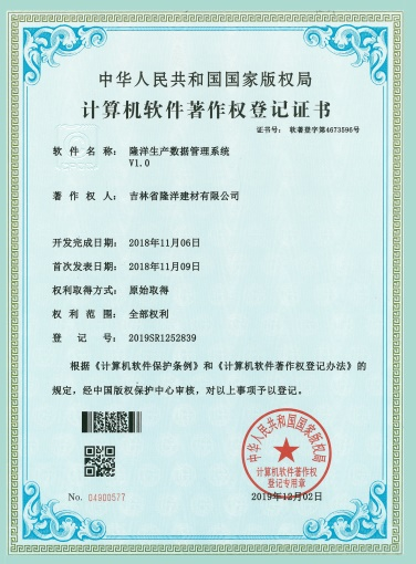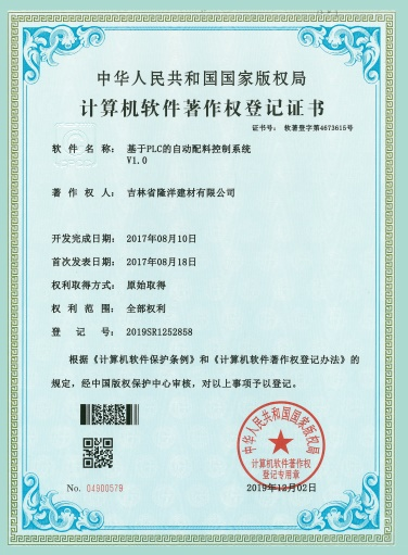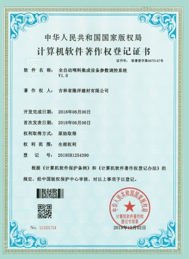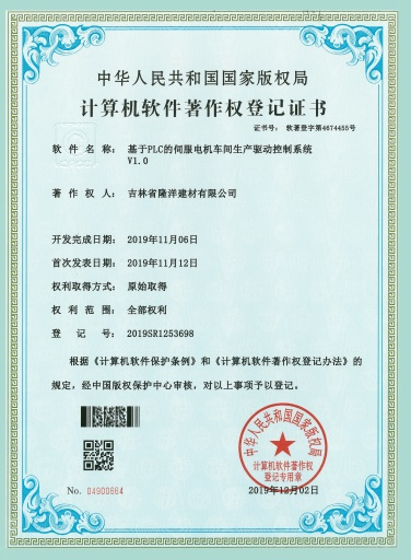 自2017年~2019年隆洋公司連續(xù)三年【榮獲裝配式墻板全自動(dòng)化生產(chǎn)計(jì)算機(jī)軟件九項(xiàng)著作權(quán):證書(shū)號(hào);第4673615號(hào);第4674524號(hào);第4673596號(hào);第4673587號(hào);第4673606號(hào);第4675147號(hào);第4673380號(hào);第4674455號(hào);第4673635號(hào);】,