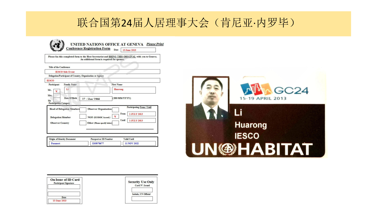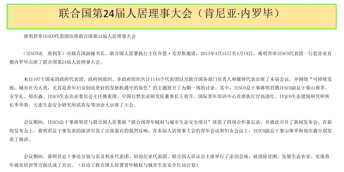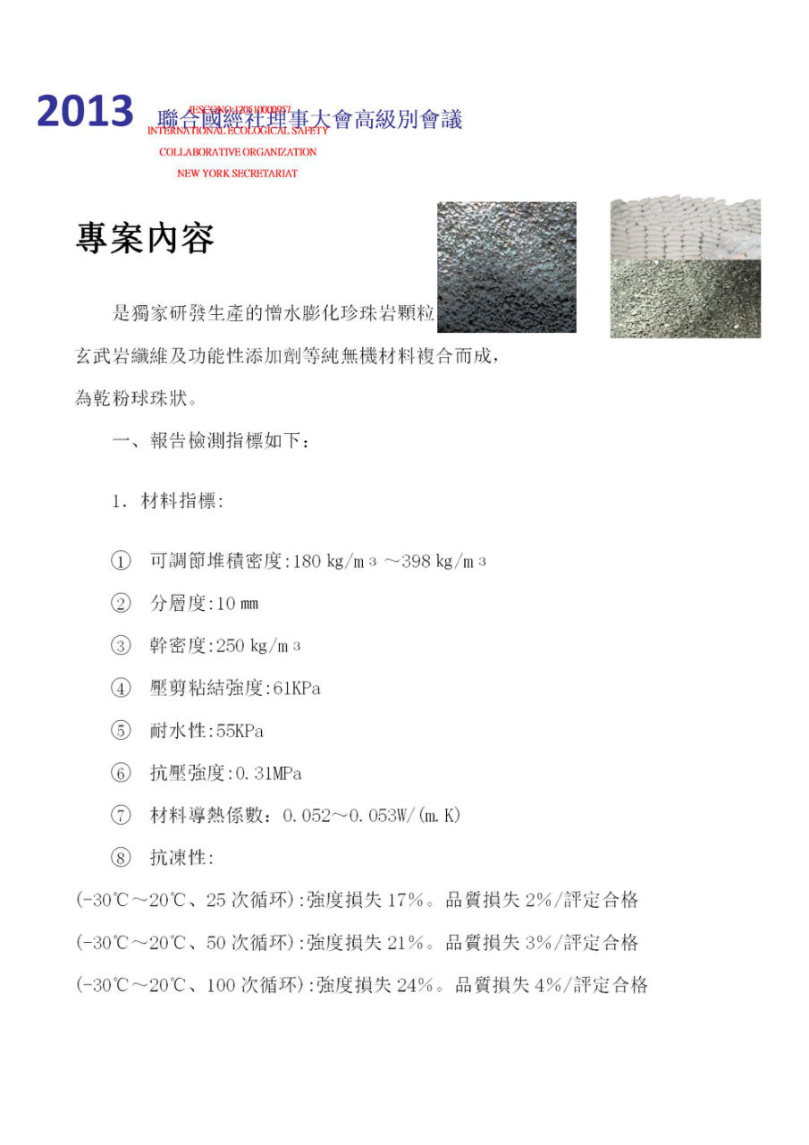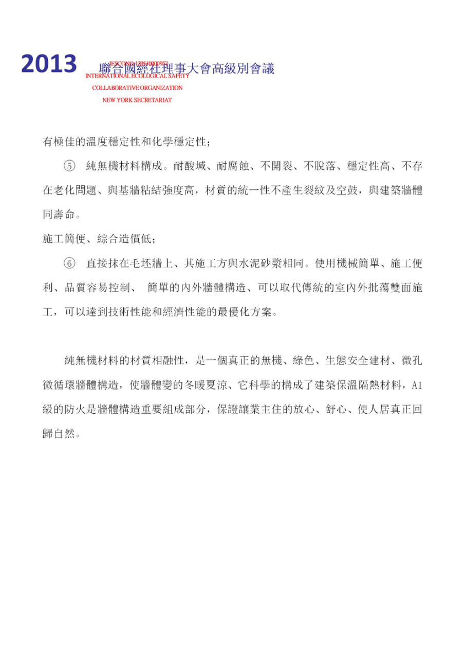 2013年4月參加聯(lián)合國(guó)人居署理事大會(huì)第24屆會(huì)議在內(nèi)羅畢召開(kāi)——倡導(dǎo)并呼吁人居建筑生態(tài)安全。 同年7月聯(lián)合國(guó)經(jīng)社理事會(huì)高級(jí)別會(huì)議——《生態(tài)安全與科技創(chuàng)新專題會(huì)議》瑞士.日內(nèi)瓦,聯(lián)合國(guó)經(jīng)社理事大會(huì)高級(jí)別會(huì)議——產(chǎn)品獲人居建筑材料《生態(tài)安全與科學(xué)技術(shù)創(chuàng)新》鑒定。 同年9月參加2013歐亞經(jīng)濟(jì)論壇——中國(guó).西安;再次倡導(dǎo)并呼吁人居建筑生態(tài)安全。