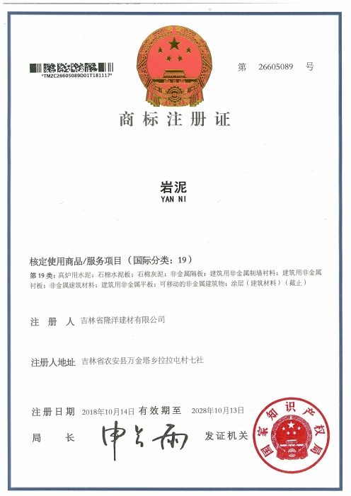 “巖泥”是吉林省隆洋建材有限公司生態(tài)安全與科技創(chuàng)新 “發(fā)明專利”;發(fā)明專利號(hào):ZL 2017 1 0759564.7。